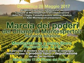che avrà come palcoscenico la storica Piazza del Popolo di Montespertoli. Wine e oil – tasting di aziende produttrici del Chianti ma anche tante iniziative tra cui segnaliamo domenica 28 maggio la “Marcia dei poderi”: una passeggiata libera con due percorsi a scelta di 4 e 9 km, con partenza a piedi dalla solita Piazza del Popolo, per andare a scoprire vigne, campi coltivati e boschetti dei dintorni. Ai partecipanti verrà consegnato un gettone per una degustazione di vino da utilizzare una volta rientrati dalla marcia, mentre a metà percorso è previsto un ristoro con accompagnamento musicale. Iscrizioni su: www.mostradelchianti.it