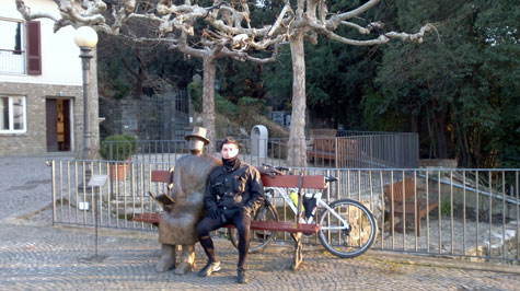 Sono i primi giorni di Marzo e la primavera che sta per giungere comincia a risvegliare mente e corpo. Così riprendono ad attivarsi anche i polpacci più pigri; quelli dei ciclisti della domenica. Con Giovanni tipico pedalatore domenicale abbiamo attraversato il ponte alla Grazie e giunti in Oltrarno in piazza Poggi, dove s’innalza porta San Niccolò. Da qui è cominciata la nostra salita del Viale Poggi. La scalata impegna i muscoli a dovere, e per chi non è abituato a pedalare frequentemente la fatica si fa sentire velocemente. Come una cartolina che magicamente prende vita, la vista in lontananza del campanile di Giotto, il Duomo, Ponte Vecchio attraversati dalle acque dell’Arno ripaga in pieno lo sforzo della salita. Eccoci a quello che credo essere uno dei più caratteristici e bizzarri giardini di Firenze: Il giardino delle rose. Il nome annuncia quello che si trova al suo interno, ma ancora la natura non ha fatto il suo corso e in attesa che i “colori”sboccino, è comunque uno spettacolo unico. Il giardino è diviso a piani collegati da piccoli viottoli di ghiaia; salite e discese mettono alla prova i muscoli delle gambe e delle braccia. Mi sbizzarrisco come un bimbo tirando il freno di dietro con sgommate che fanno alzare piccole nuvolette di fumo bianco. Consiglio una mountain bike o ruote tassellate su questi percorsi; l’aderenza sulla ghiaia è molto scarsa e si rischia di alzarsi in piedi sui pedali facendo slittare la ruota posteriore e frantumando sulla canna i propri “gioielli di famiglia”.Siamo accompagnati da un melodico suono di chitarra proveniente da un artista di strada che si trova sotto le scalinate del Piazzale Michelangelo, natura musica e una vista che toglie il fiato si fondono in un unico scenario. Nella terrazza di mezzo, si possono apprezzare decine di vasi con diverse tipologie di piante con le etichette dei nomi in latino, che mi riportano indietro ai tempi del liceo. Una piccola fontana circondata dal verde delle piante ospita pesci rossi e bianchi e piccole tartarughe. Il giardino ospita una mostra permanente dell’artista “ Jean –Michel Folon”, prevalentemente statue di bronzo rappresentanti persone: una legge un libro a sedere su di una panchina, un’altra guarda il panorama della città, una che al posto della testa ha un vaso. Tutte come noi visitatori attendono che le rose sboccino.