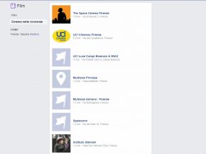 “Film” fornisce un elenco dei film in programmazione in zona (la zona è geolocalizzata, ma è ovviamente possibile modificarla a mano), con locandina e classificazione del genere. Scorrendo la pagina si arriva ad una sezione di film di prossima uscita e infine ad una sezione quelli popolari tra gli amici.