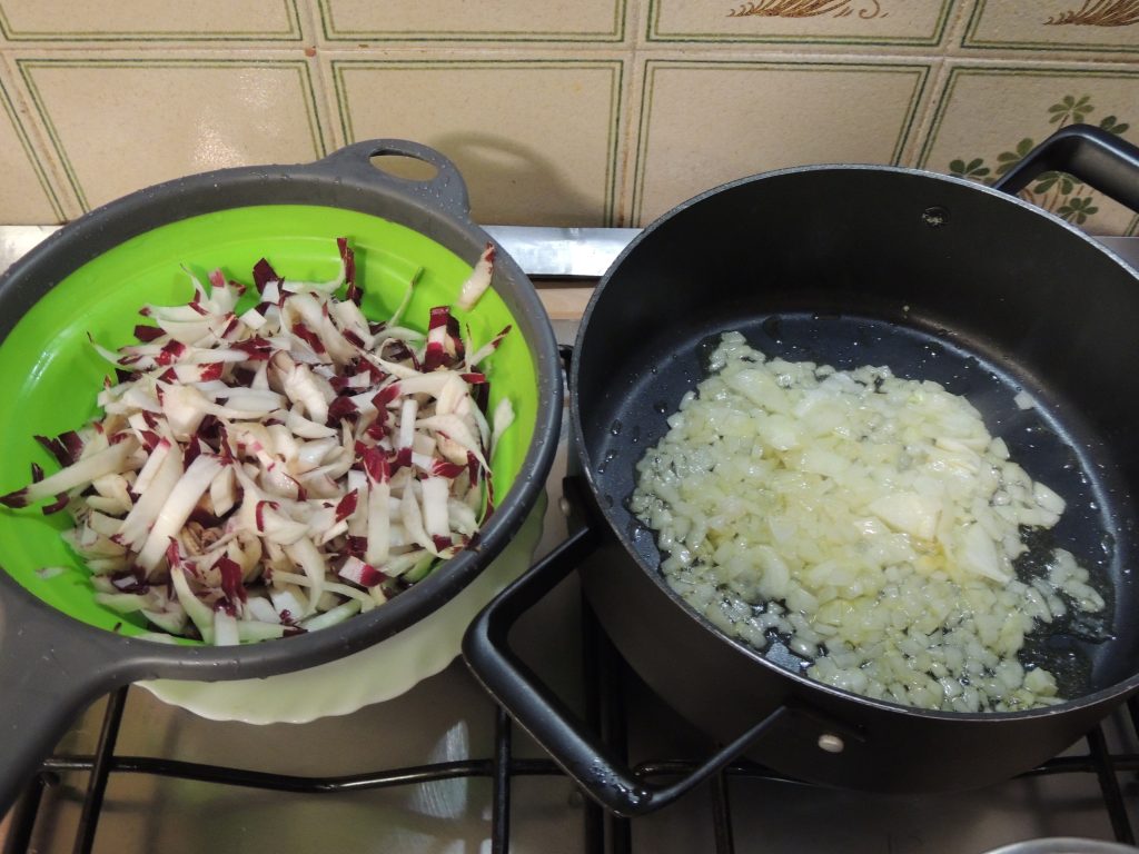 Nel frattempo pulite il radicchio e tagliatelo a julienne, aggiungendolo poi in pentola insieme alla cipolla e fate rosolare a fuoco medio per qualche minuto. Quando si sarà appassito togliete il tutto e mettetelo in una ciotola.
