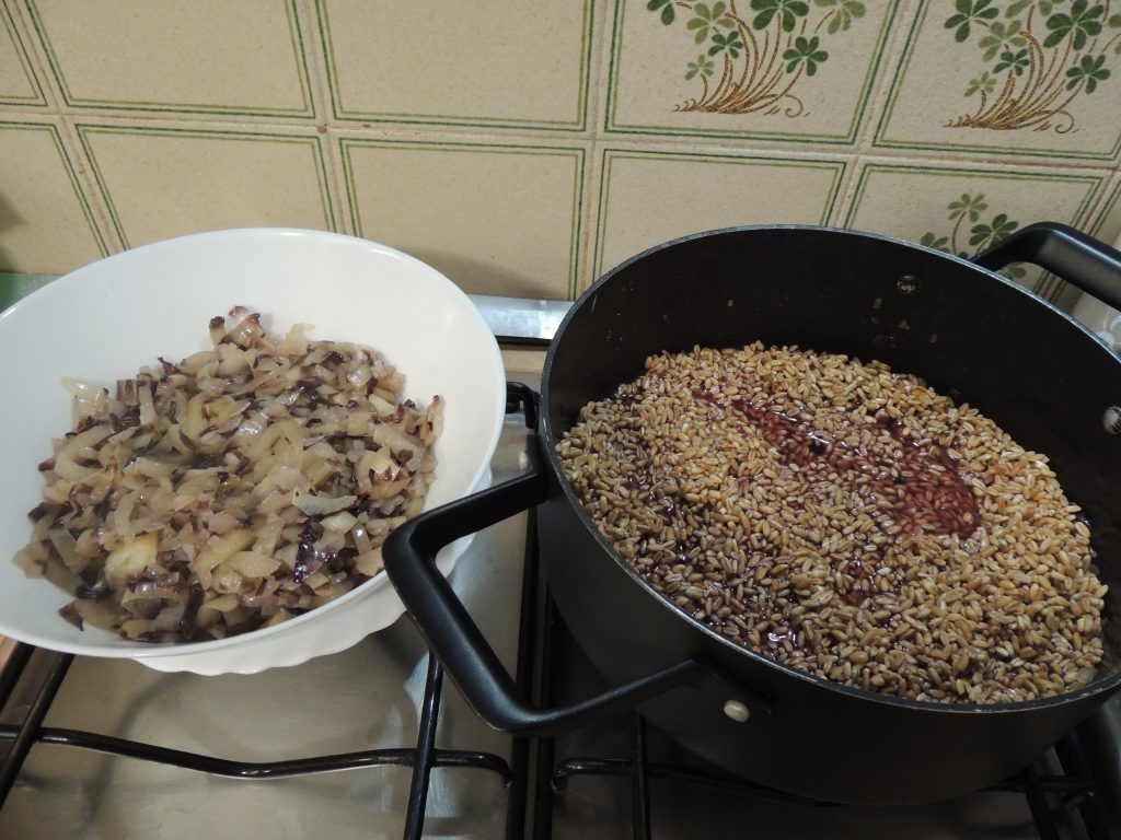 Questo piatto nasce anche dall’esigenza che avevo di consumare parte del radicchio oblungo che avevo in frigo. È un tipo di radicchio che mi piace molto, ma nella sua parte finale, risulta abbastanza duro e amaro, non molto apprezzabile a crudo. Quindi ho deciso di cuocerlo e di mantecarlo con il farro.