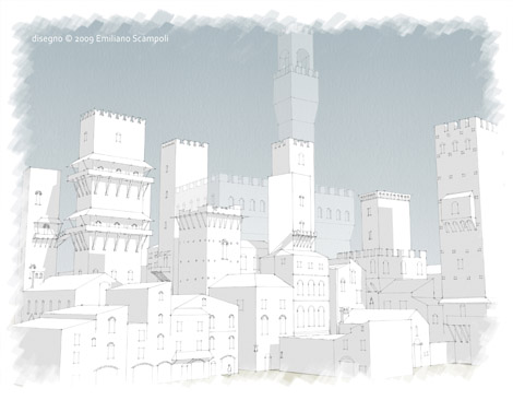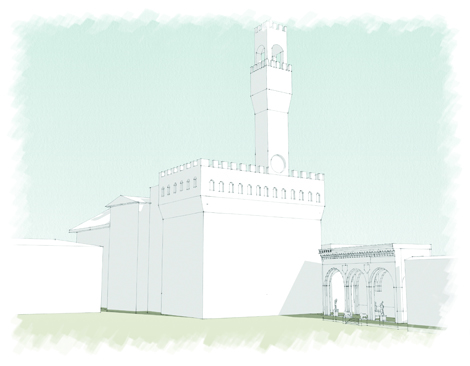 Prima della realizzazione del Palazzo dei Priori (ora chiamato Palazzo Vecchio) l’area di piazza della Signoria era un quartiere medievale con un dedalo di vie e viuzze. Le chiese a le case erano dominate da diverse torri appartenenti alle famiglie più importanti. Le torri erano strutture imponenti, in muratura, con terrazze in legno e collegamenti aerei con altre torri. A cosa servivano queste torri e cosa c’entrano con la torre di Palazzo Vecchio?