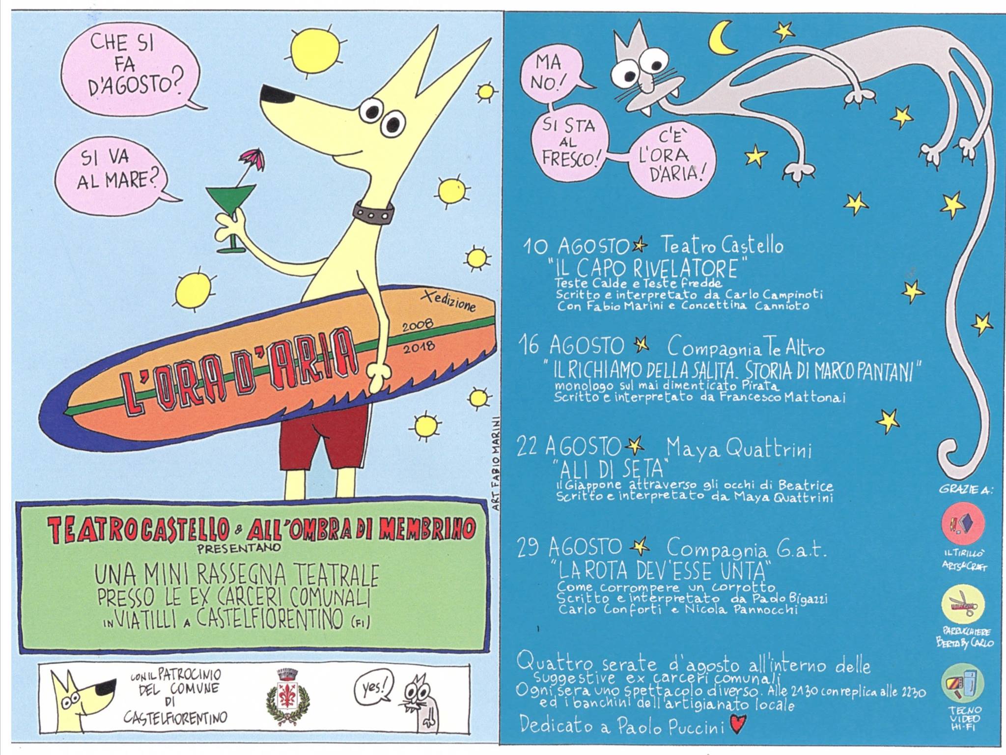 Quattro spettacoli ad ingresso gratuito verranno presentati nel mese di agosto con inizio alle 21:30 e replica alle 22:30. L’edizione di quest’anno sarà dedicata all’ideatore della rassegna Paolo Puccini scomparso prematuramente che andò a recuperare uno spazio di Castelfiorentino altrimenti inutilizzato. Nelle vicinanze dell’ex carcere sarà presente anche un piccolo mercato artigianale.