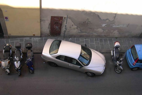 Carissimi amici, siamo sempre alle solite. Uno dei problemi più sentiti ai giorni nostri è senza dubbio l’omologazione. In tutte le sue forme, anche quelle più subdole e meno appariscenti. Ma come è possibile, ci chiediamo allora, sfuggire ai tentacoli striscianti ed avvolgenti di un tale assillo martellante? Può sembrar banale ma, se ci riflettete un attimo, a bocce ferme come si dice a Firenze, serve solo un po’ di fantasia e di intraprendenza. In fondo siamo o non siamo in un paese libero e tollerante? (Attenzione, può sembrare innoqua ma è una domanda a trabocchetto…) Ed allora approfittiamo pienamente delle libertà di forma e d’espressione sancite dalla nostra Costituzione. Cosa sono tutte quelle misere vetture parcheggiate una in fila all’altra e quegli scooter che, come tanti soldatini di piombo in parata, opprimono visivamente lo spirito sbarazzino del nostro animo automobilistico? Ribelliamoci dunque! Prendiamo coraggio ed usciamo dal coro! Facciamo come il genio (sic!) immortalato nella nostra foto. Sfruttiamo gli spazi in modo fantasioso, sovvertiamo l’ordine in modo originale e, come novelli architetti d’avanguardia, pensiamo fuori dagli schemi tradizionali. Se poi non è proprio previsto il parcheggio a spina di pesce non è certo colpa sua. Ed allora, avrà pensato il genio, perché rinunciarci? Non guastiamoci la giornata nemmeno noi, per così poco, e prendiamo invece esempio da lui. Un dettaglio, un piccolo gesto di ingenua ribellione può bastare per uscire dalla noia e dal grigiore del quotidiano. Il genio spesso si nasconde nelle pieghe, nelle sfumature. Disobbedienza civile dunque… o forse gli s’era semplicemente incastrato il blocca-sterzo?