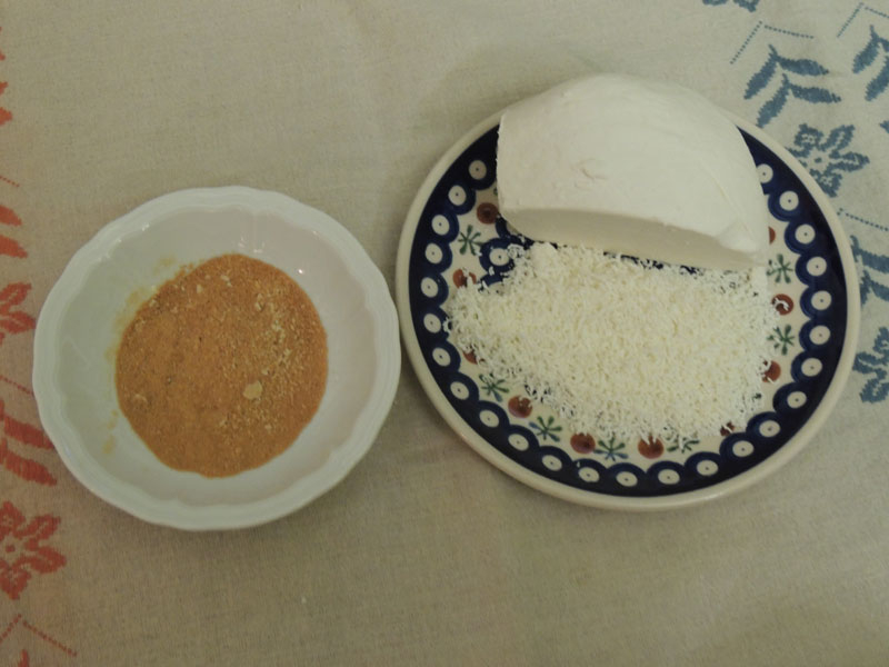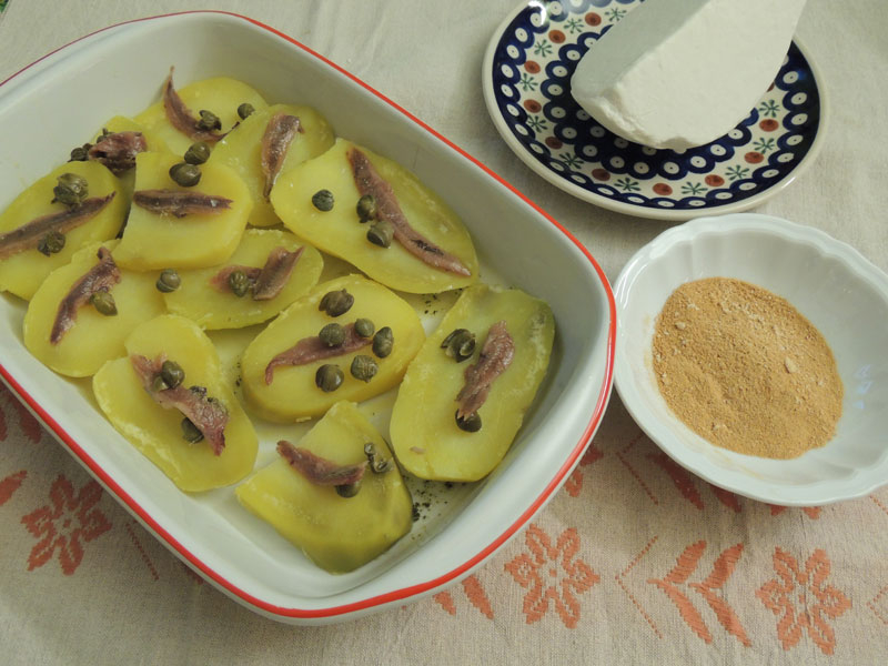Prendo una pirofila, la cospargo di olio e sistemo le fette di patate quasi cotte. Su ciascuna fetta, metto la composta di capperi e acciughe. Inforno per circa 20 minuti, fino a quando la composta si scioglie e le patate giungono a cottura. Nel frattempo, tosto del pangrattato, e lo mescolo alla ricotta grattugiata. A cinque minuti della fine della cottura, spolvero il pangrattato la ricotta e l’origano, sulle patate e rimetto in forno per la doratura.