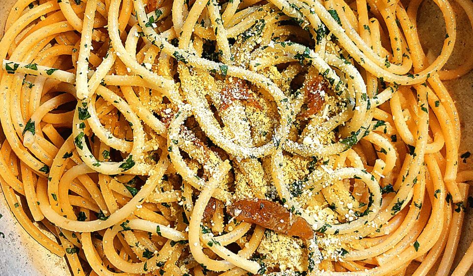 Impiattiamo i nostri spaghetti versandoci sopra dei pezzetti di guancia e guarnendo con il pangrattato tostato con un filo d’olio, e una spruzzata di prezzemolo tritato finemente.