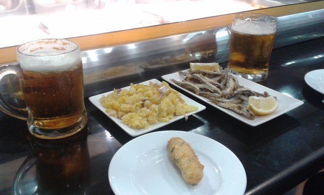 Arredamento essenziale, con le immancabili maioliche tipiche della città iberica a decorare le pareti, banco con qualche specialità esposta, servizio spiccio ma cortese. Non molto frequentato, tolto le ore di punta di pranzo e cena, perciò ho potuto trovare agevolmente posto al banco. Riesco ad ordinare e gustare una frittura di “pescado” (una sorta di frittura di paranza), baccalà, sempre fritto, e delle ottime “patate brave” all’aglio. Il tutto annaffiato da birra alla spina. Non sono così ingordo. Essendo particolarmente abbondanti conviene ordinare solo una porzione a testa, per tipo (che ho diviso con il mio compagno di viaggio), per potere assaggiare più specialità.