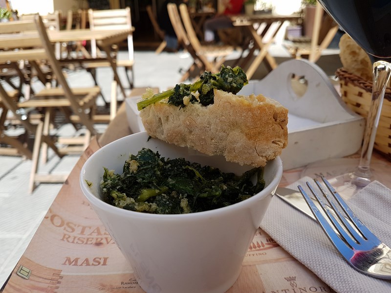 Ed è stato in una di queste situazioni in cui ho avuto il piacere di assaggiare la Rocciata. Specialità tipica delle Marche e dell’Umbria fatta in svariate versioni, sia dolci che salate. La torta salata che mi è stata proposta è risultata poi essere la più tipica, a base di spinaci, cicoria e pecorino. Il tutto dovrebbe poi venire chiuso in pasta sfoglia che, a causa di un tardo orario del mio pranzo, non era più disponibile. Infatti nel locale hanno improvvisato una versione della Rocciata in ciotola con un pezzo di schiacciata a parte, che comunque è risultata essere ottima!