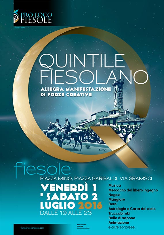 E se preferite l’ari aperta perché non salire sulla collina di Fiesole? Oggi e domani dalle 19.00 alle 23.00 la nuova pro loco del comune ha organizzato la prima edizione del “Quintile Fiesolano” due serate all’insegna del divertimento per un’allegra manifestazione di forze creative. Una manifestazione dedicata alla musica, ai negozi, al bere e al buon mangiare con giocolieri, animazione per bambini e mercatino del libero ingegno. Il tutto da piazzetta del teatro Romano a Piazza Mino, Piazza Garibaldi, via Gramsci .Con un braccialetto acquistabile al gazebo Pro Loco al prezzo simbolico di 1 Euro si potrà accedere alle promozioni di ristoranti e bar.